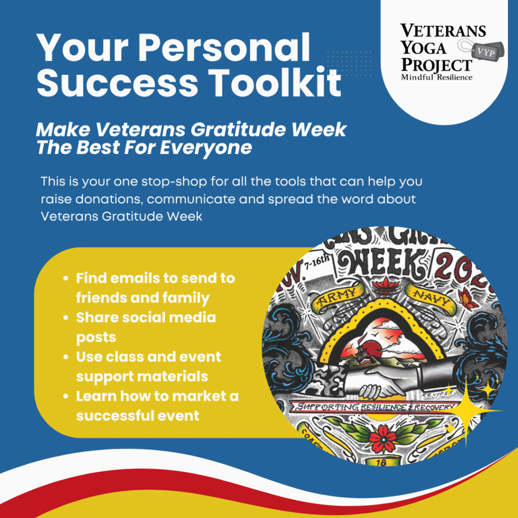 Welcome to Veterans Gratitude WeekVGW Resources Register Your Class Start Your Fundraiser Sponsors Media Room Class Event Materials Create & Market Your Event Email Marketing & Materials Media Room Social Media Materials Have Questions or Need Support?vgw@veteransyogaproject.org VGW Homepage